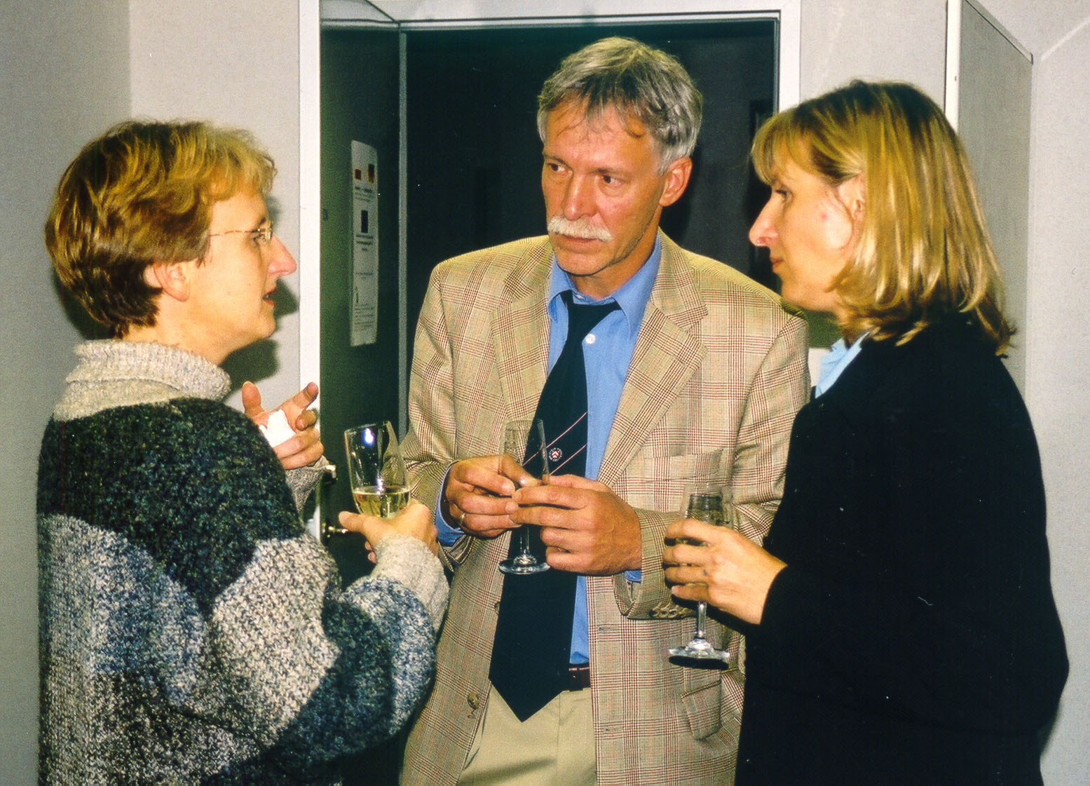 Michael Daalmann, Vorsitzender des Absolventen-Netzwerks der Universität Bielefeld, im Gespräch mit den Alumnis Jolanta Zurek (l.) und Anna Golys (r.).