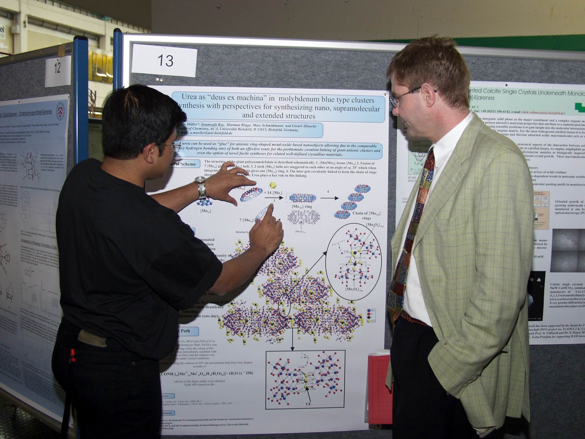 Bild: Das Workshop-Programm des internationalen Graduiertenstudiengangs Chemie und Biochemie wurde ergänzt durch eine Posterpräsentation; rechts im Bild der Initiator des Promotionsstudiengangs Norbert Sewald.Bildnummer: 10998