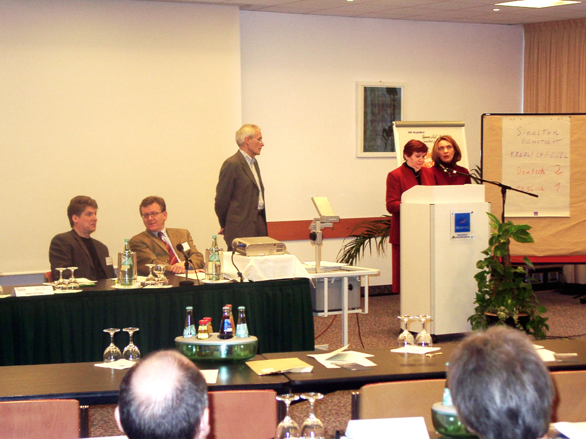 Zur Neubestimmung Sozialer Dienste in modernen Gesellschaften fand vom 17. bis 19. Oktober in Bielefeld die internationale Tagung ?Negotiating Qualities ? Soziale Dienste zwischen Kostenkontrolle und Nutzerorientierung? statt. Das Foto zeigt (von links): Dr. Stefan Schnurr (Rostock), Prof. Dr. Andreas Schaarschuch (Wuppertal), Prof. Dr.Dr. h.c. Hans-Uwe Otto (Bielefeld), Zinaida Brystrova (Leningrad) mit Elena Schönfeld (Dolmetscherin Bielefeld).