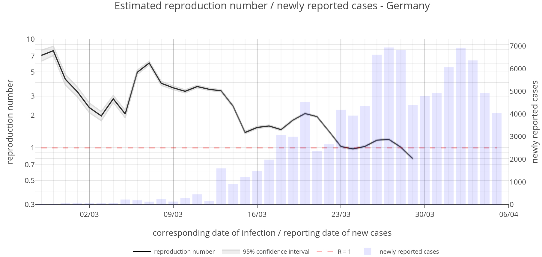 Figure: Evolution of the reproduction number for Germany over time. Data source: Johns Hopkins University.