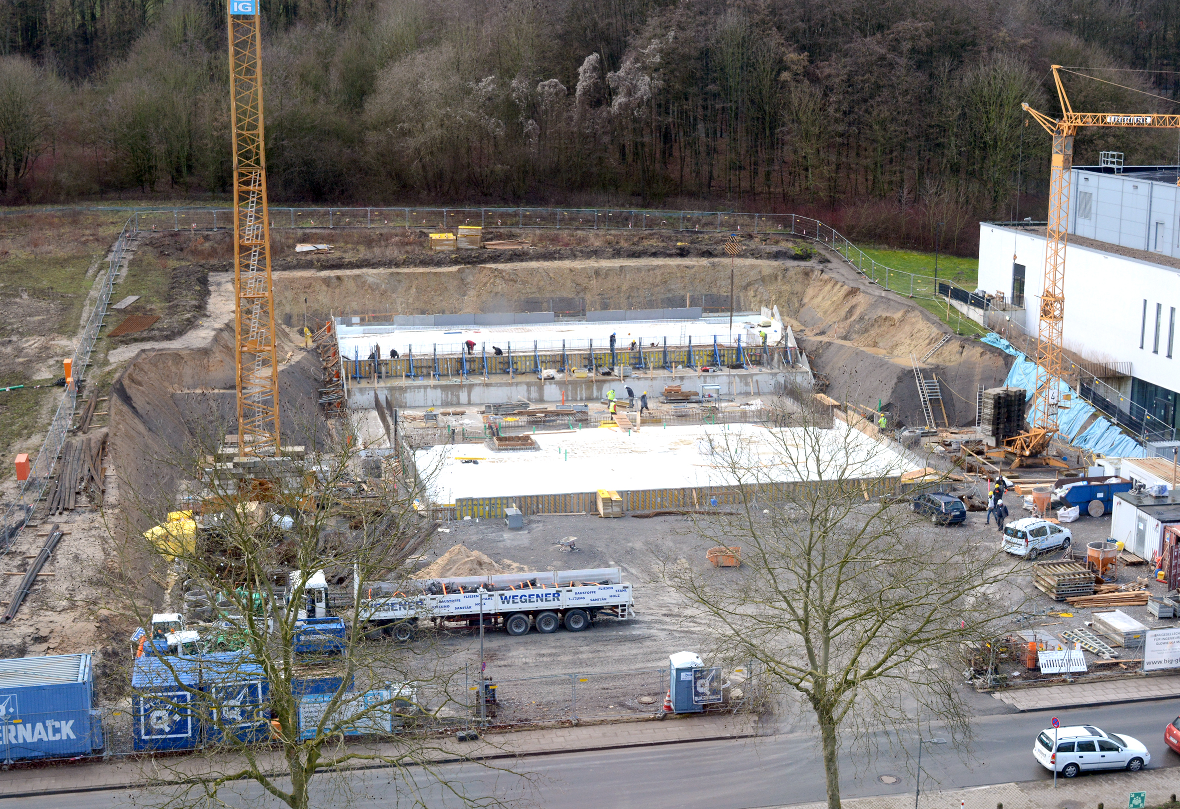 Wenige Meter neben dem Universitätshauptgebäude entsteht das neue Hörsaalgebäude Y. In direkter Nachbarschaft zum Gebäude Z werden ein Hörsaal mit etwa 700 Plätzen und drei Seminarräume errichtet. 1.010 Quadratmeter Hauptnutzfläche stehen in dem Neubau an der Konsequenz zukünftig zur Verfügung. Bauherrin ist die Universität Bielefeld. Foto: Universität Bielefeld