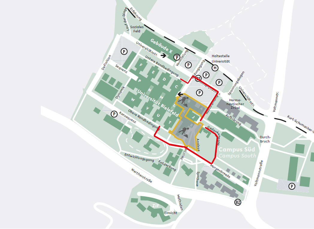 Die Wegeführung vom Hauptgebäude zum Q-Gebäude führt zukünftig über die Konsequenz/Morgenbreede und den Gedankengang. Alternativ führt der Weg über den Ausgang bei C01, die Brücke entlang, runter auf die Universitätsstraße und über die Ausstrahlung hoch zum Q-Gebäude. Illustration: Universität Bielefeld