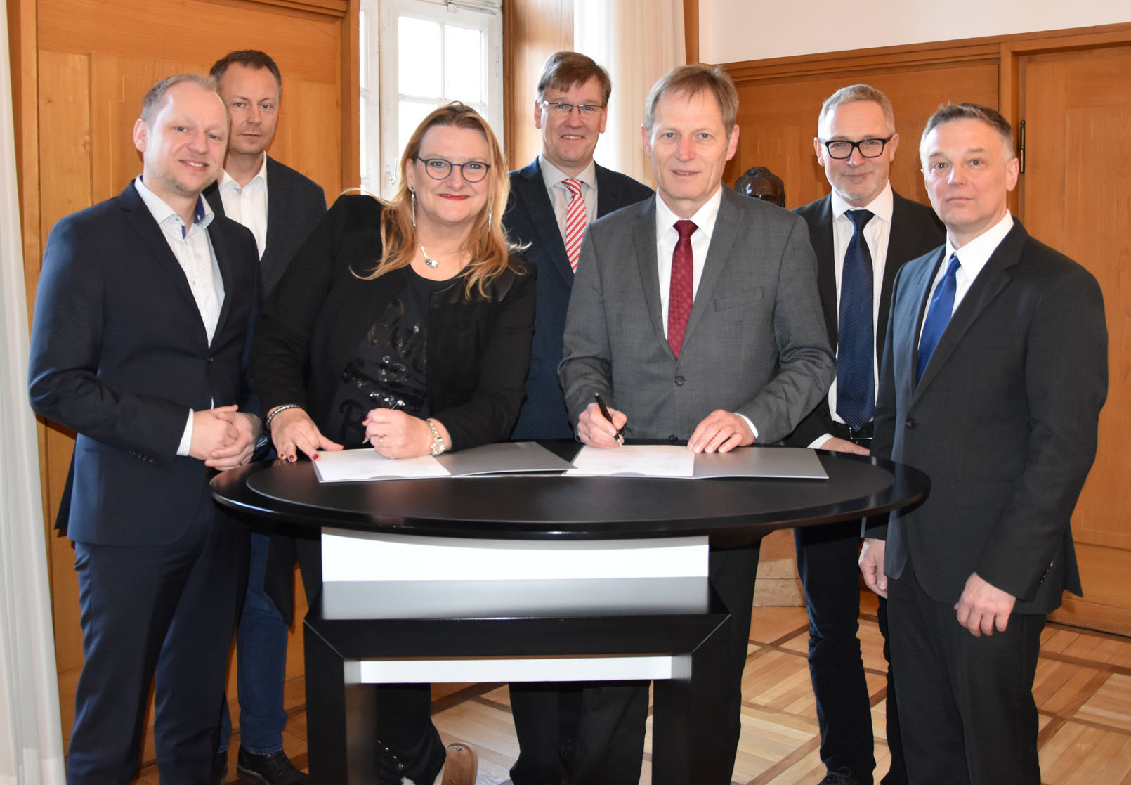 Vertreterinnen und Vertreter der kooperierenden Hochschulen (v. l.): Rudolf Dück (Bielefeld), Olaf Jacobsen (Bielefeld), WWU-Prorektorin für Forschung Prof. Dr. Monika Stoll, WWU-Rektor Prof. Dr. Johannes Wessels, Prof. Dr. Reinhold Decker, Prorektor für Informationsmanagement der Universität Bielefeld, Dr. Raimund Vogl (IT-Leiter WWU) und Jörg Lorenz (ULB Münster). Foto: Kathrin Kottke