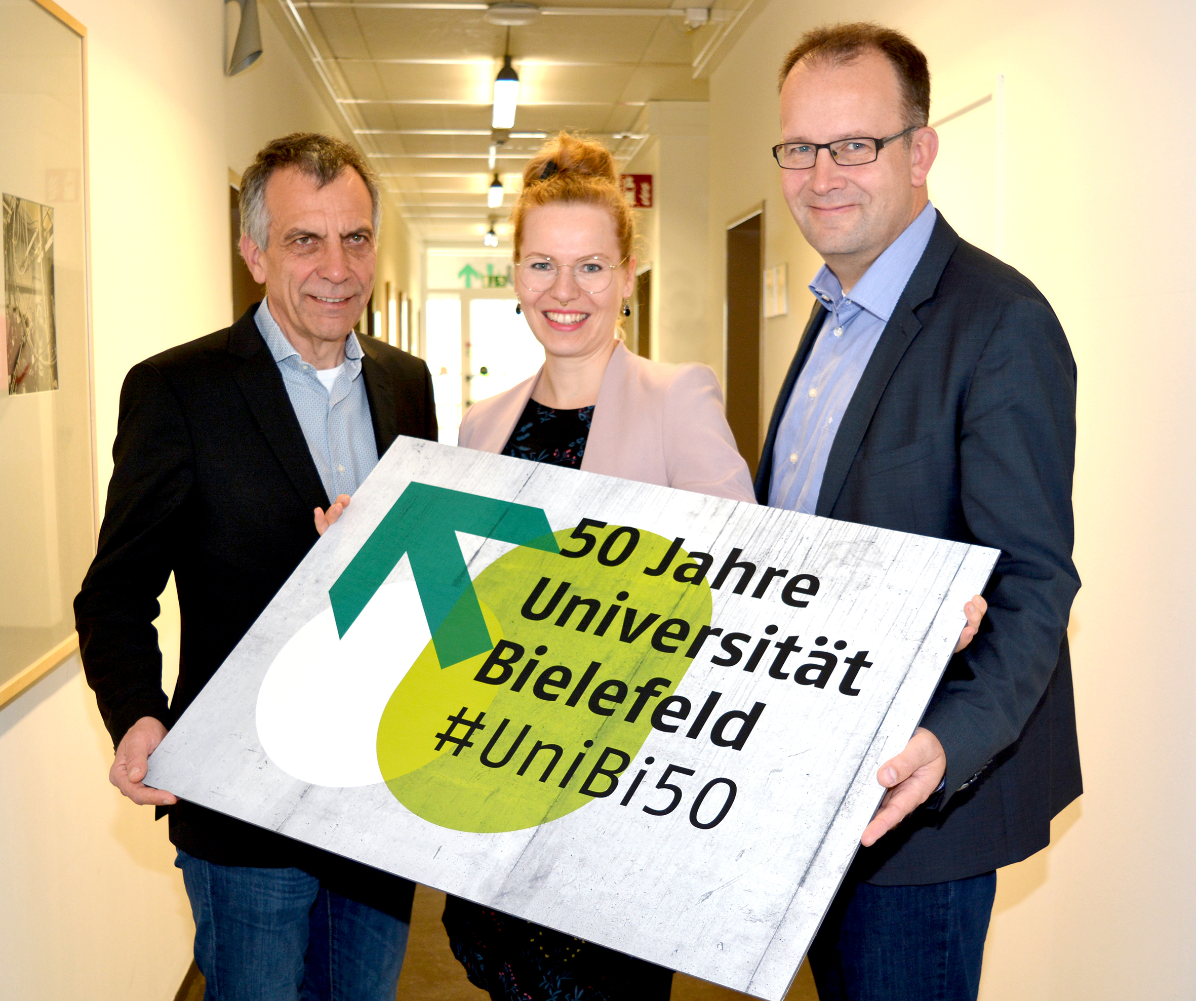 Rektor Gerhard Sagerer, Dr. Sarina Bornkessel und Martin Knabenreich (v.l.) mit dem neuen Jubiläumslogo. Foto: Universität Bielefeld