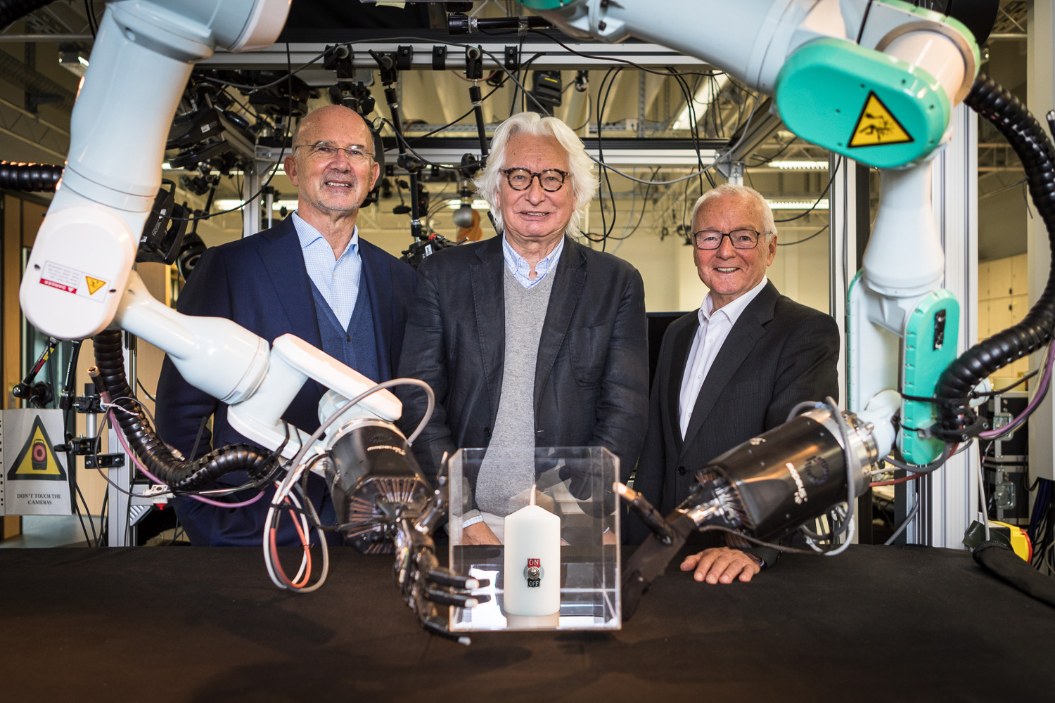 Die Initiatoren des Jörg Schwarzbich Inventor Award, der ab 2019 von der UGBi Universitätsgesellschaft Bielefeld vergeben wird (v. l.): Herbert Vogel, UGBi Vorstandsvorsitzender, Stifter und Erfinder Jörg Schwarzbich, Jürgen Heinrich, Mitglied des Vorstands und Geschäftsführer der UGBi. Die Roboterhände halten das Preissymbol, eine Kerze mit Lichtschalter. Foto: Stefan Sättele