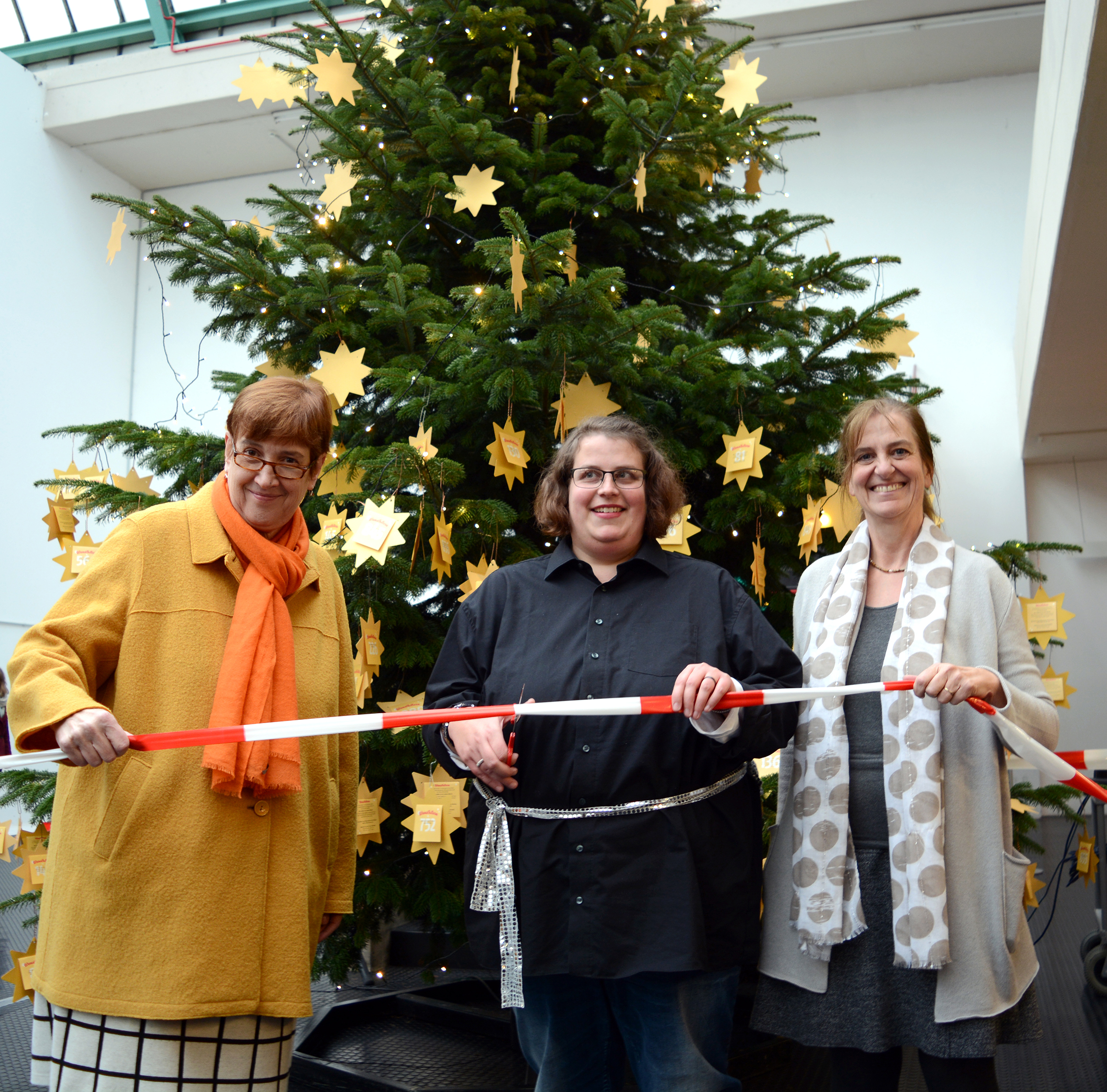Startschuss für die Suche nach den Wünschen: Sarah aus der Tanzgruppe schneidet gemeinsam mit Johanna Will-Amstrong (l.) und Bettina Lang das Band durch. Foto: Universität Bielefeld