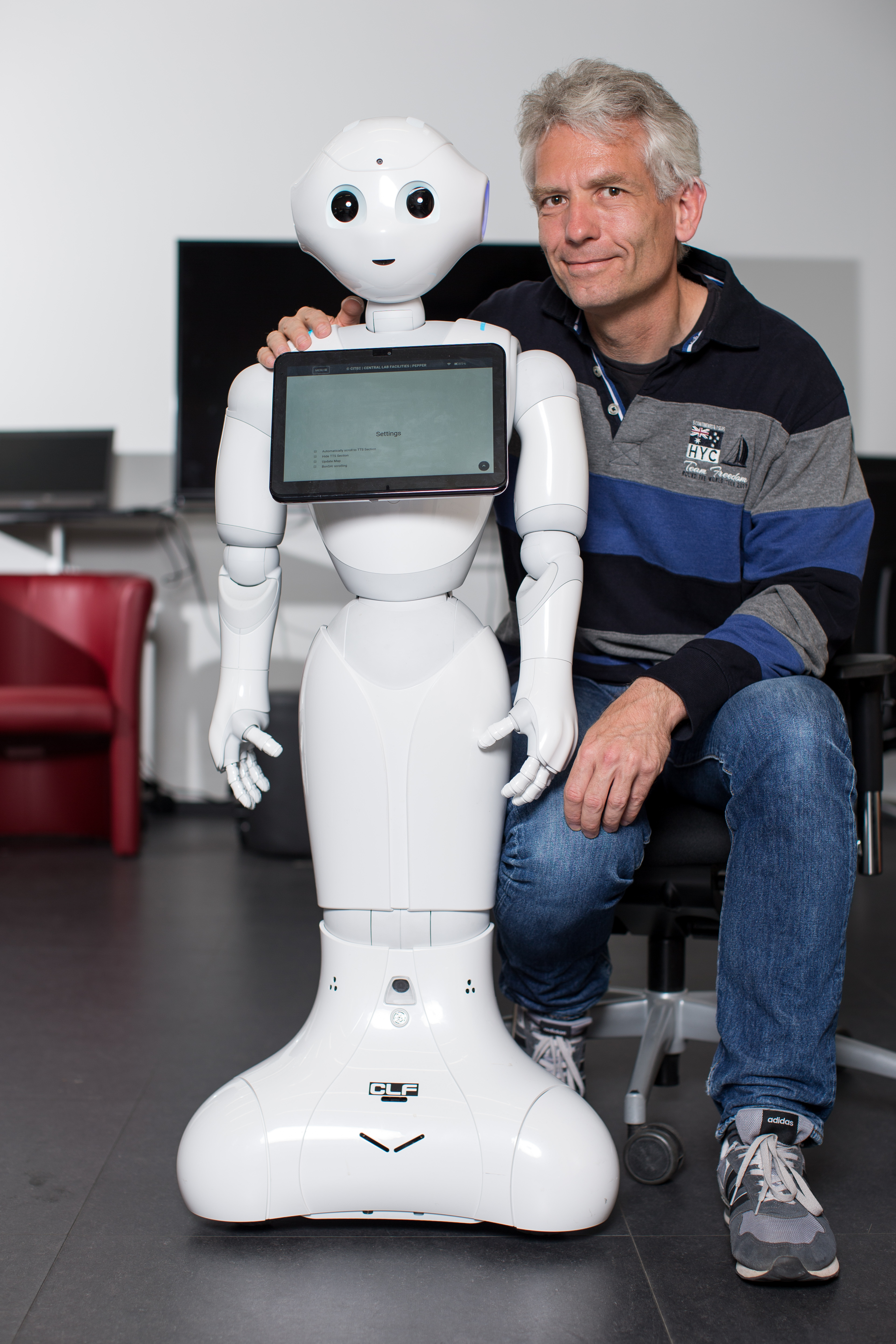 Die Bielefelder Studierenden entwickelten die Software von Pepper weiter, sodass der Ro-boter wesentlich robuster auf sein Umfeld reagieren kann. Foto: CITEC/F. Gentsch