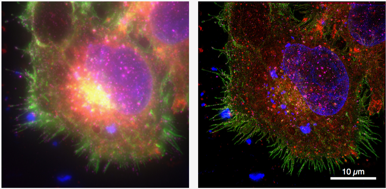 Menschliche Zelle unter konventionellem Mikroskop (links) und hochauflösendem Mikroskop (rechts). Bild: Dr. Wolfgang Hübner
