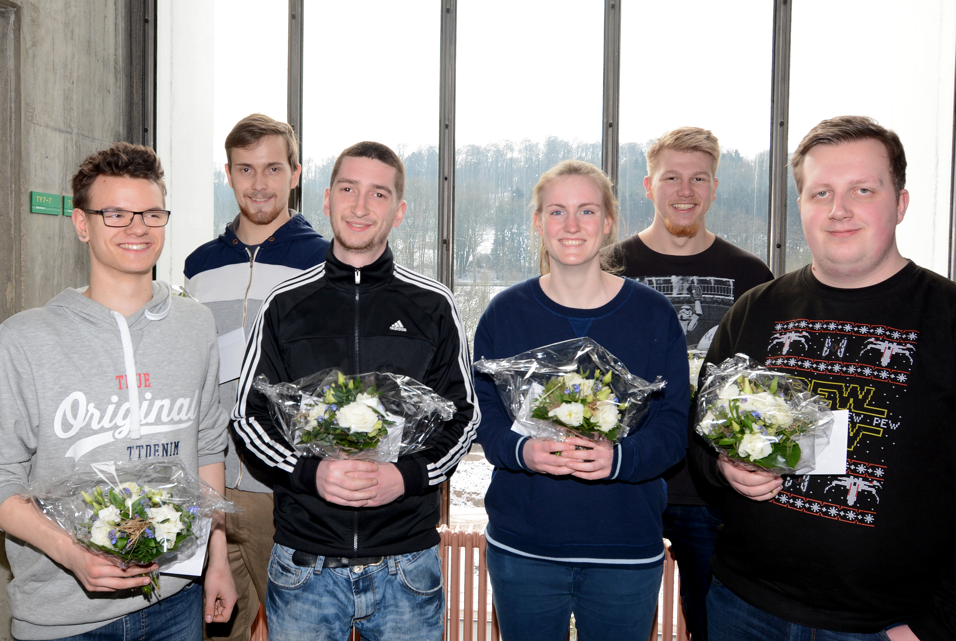 Florian Platzbecker, Tobias Pöhl, Marcel Smith, Annalena Lausch, Jacob Meyer und Kilian Krupinski (v.l.) erhielten auch einen Gutschein für den UniShop. Foto: Universität Bielefeld