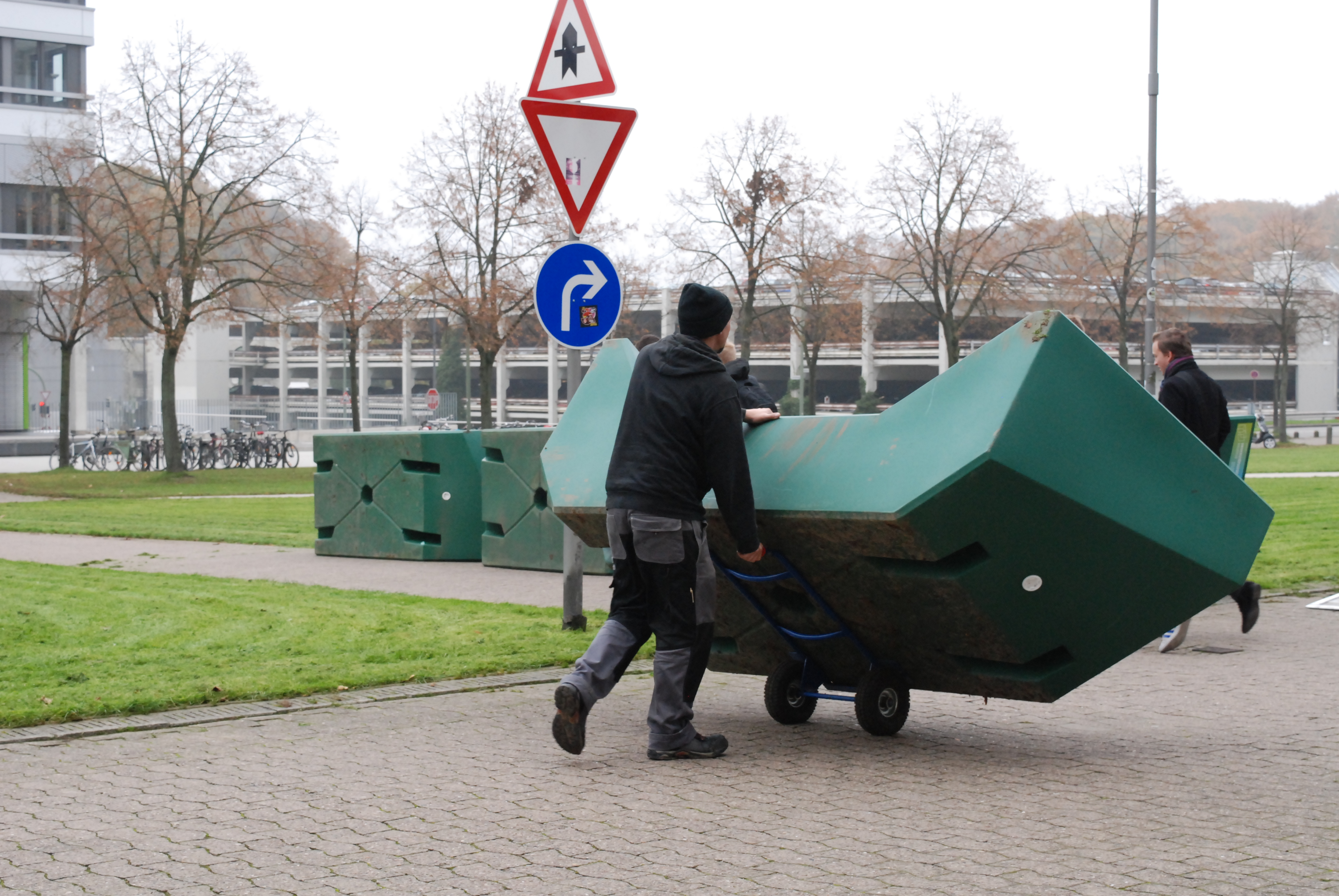 Mitarbeiter einer Umzugsfirma lagern die Freiluftmöbel ein. Foto: Universität Bielefeld