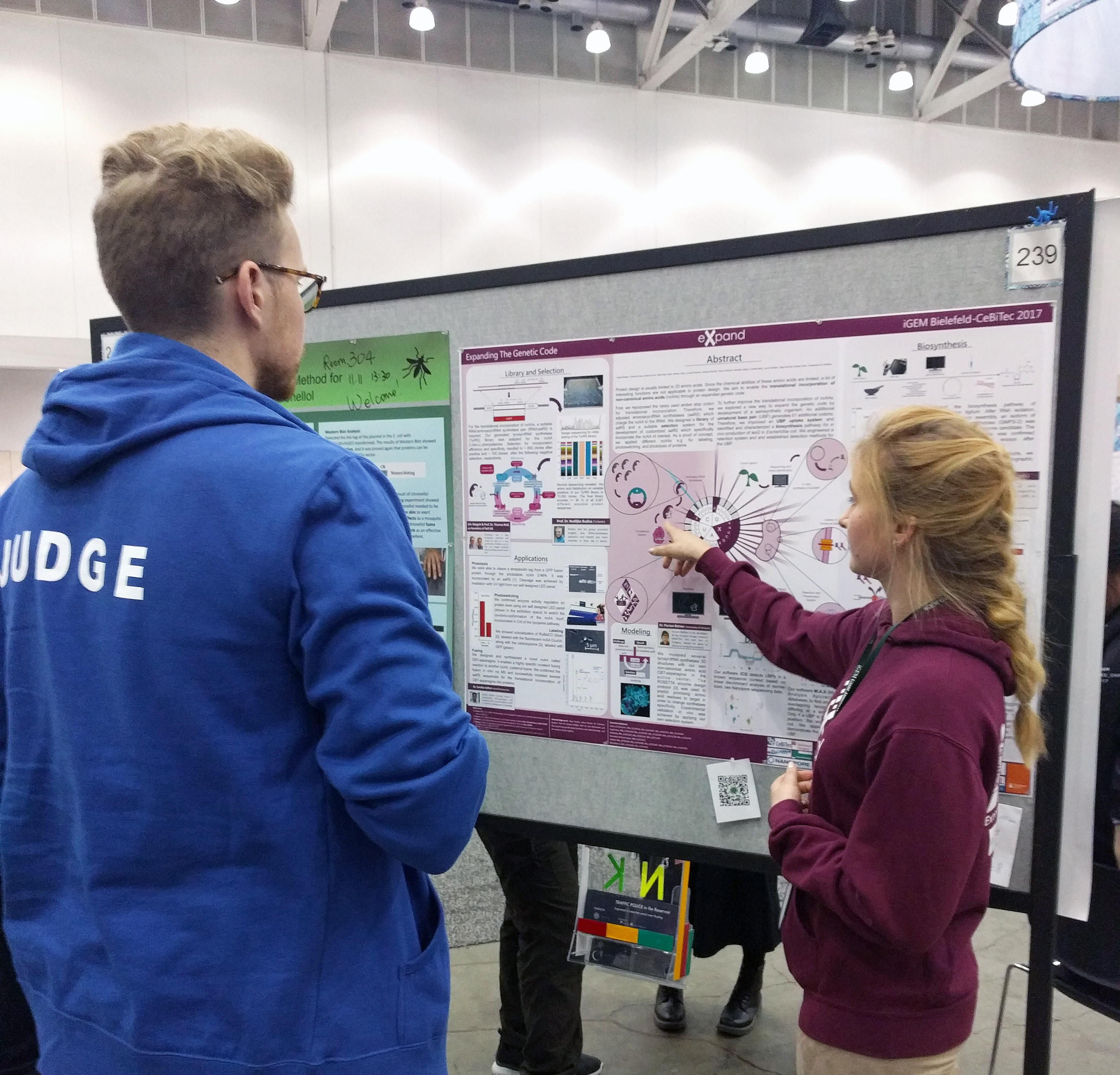 Teammitglied Svenja Vinke erklärt das Projekt einem der Jurymitglieder. Foto: iGEM Bielefeld-CeBiTec 2017
