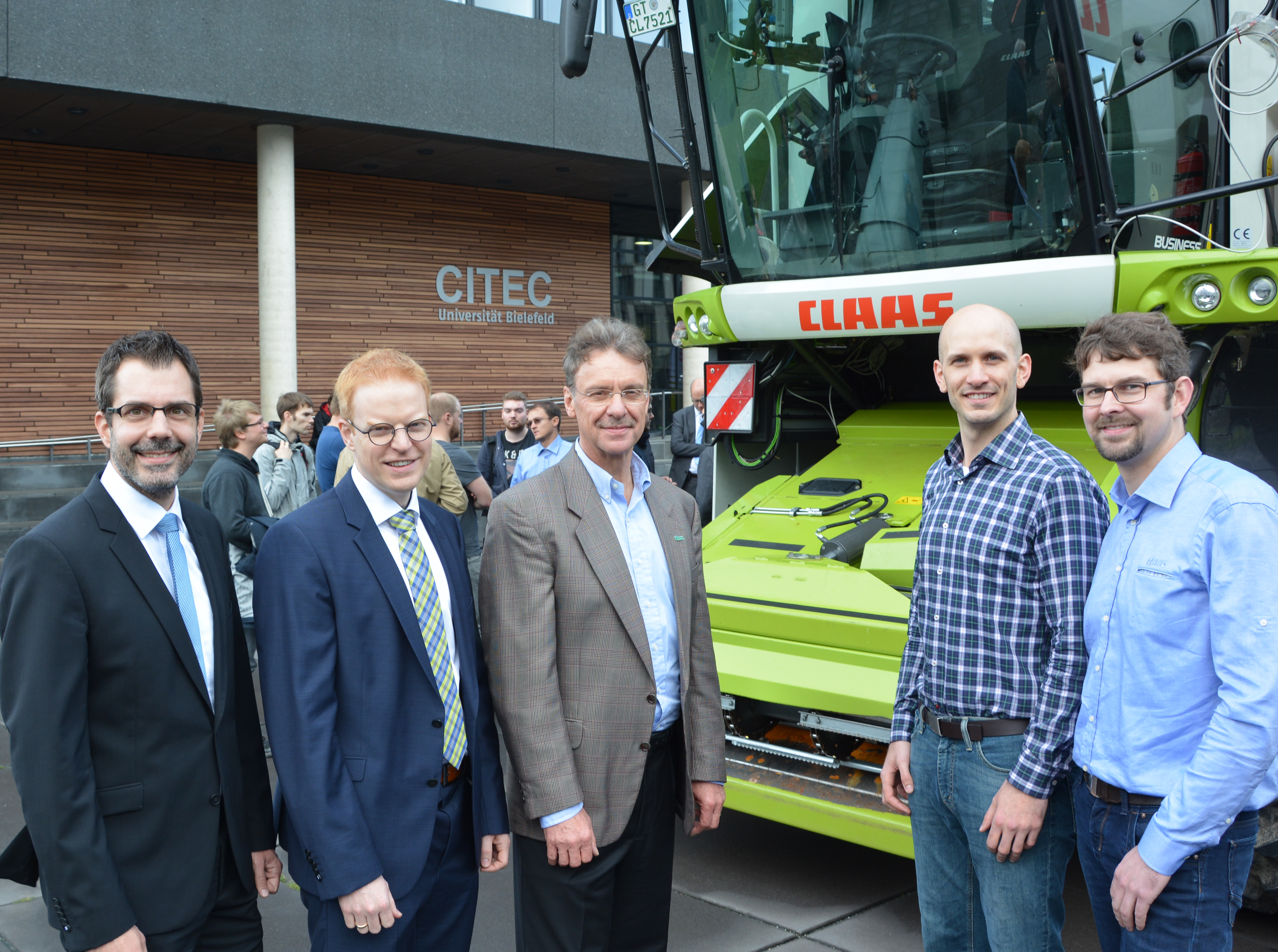 Presenting their new system (pictured from left): Dr. Thorsten Jungeblut (CITEC), Dr. Boris Kettelhoit (CLAAS), Prof. Dr. Ulrich Rückert, Timo Korthals (both CITEC), and Thilo Krause (CLAAS). Foto: CITEC/Bielefeld University