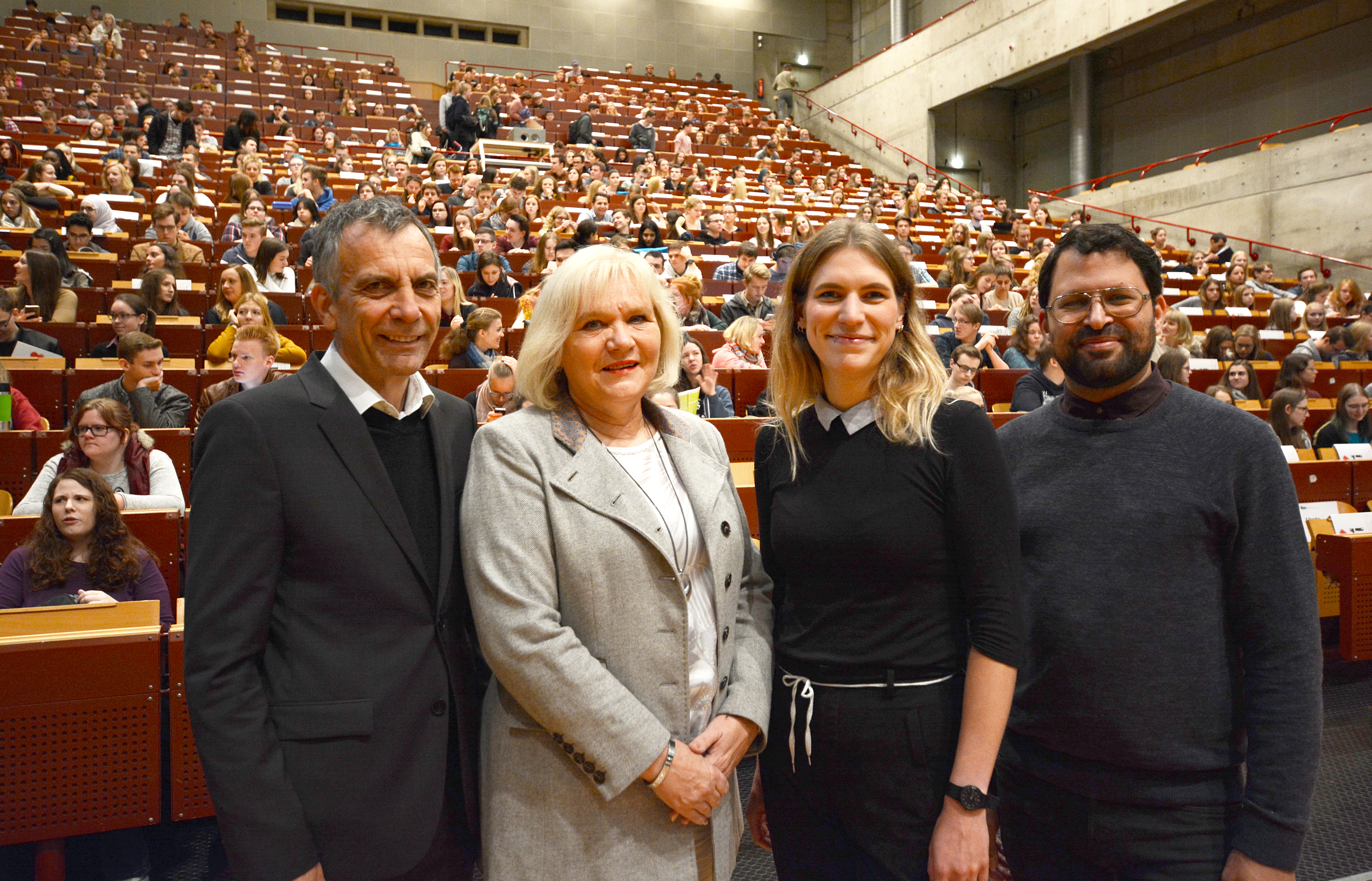 Begrüßten die Erstsemester (v.l.): Rektor Prof. Dr.-Ing. Gerhard Sagerer, Bürgermeisterin Karin Schrader sowie die Vorsitzenden des AStA Viktoria Haß und Sami Maztoul. Foto: Universität Bielefeld