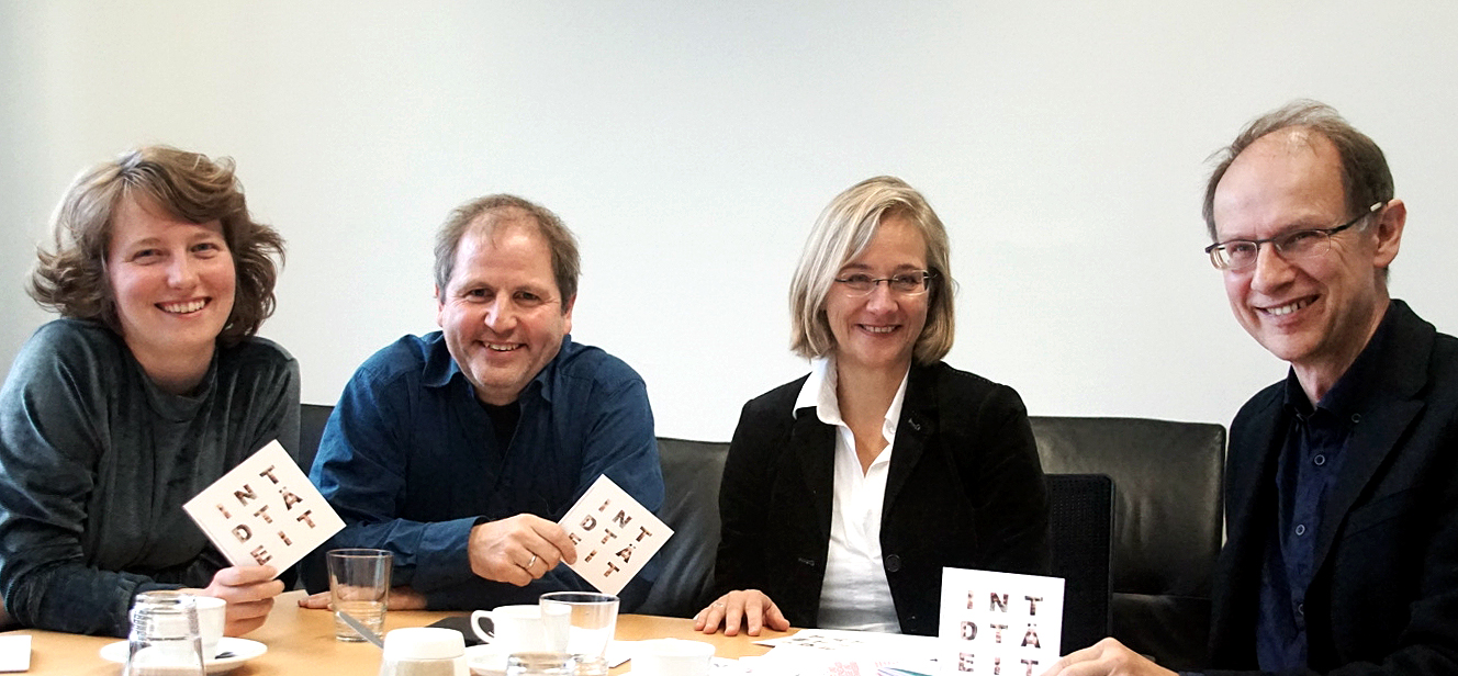 Die Organisatoren stellten das Programm des Kooperationsprojekts Identität vor (v.l.): Nicole Zielke, Matthias Gräßlin (beide Theaterwerkstatt Bethel), Prof. Dr. Angelika Epple (Prorektorin für Internationales und Diversität der Universität Bielefeld) und Dr. Hans-Martin Kruckis (Programmleiter des Zentrums für Ästhetik der Universität Bielefeld). Foto: Universität Bielefeld