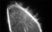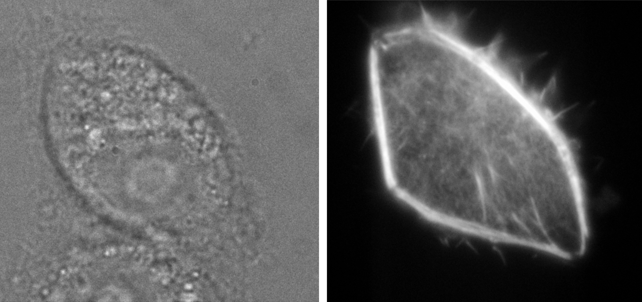 Bild: Eine Glaspipette injiziert leuchtfähige Moleküle in eine Nierenzelle (Bild links). Wenige Sekunden später leuchten die Moleküle und lassen neue Details erkennen (Bild rechts). Foto: Universität BielefeldBildnummer: 110745