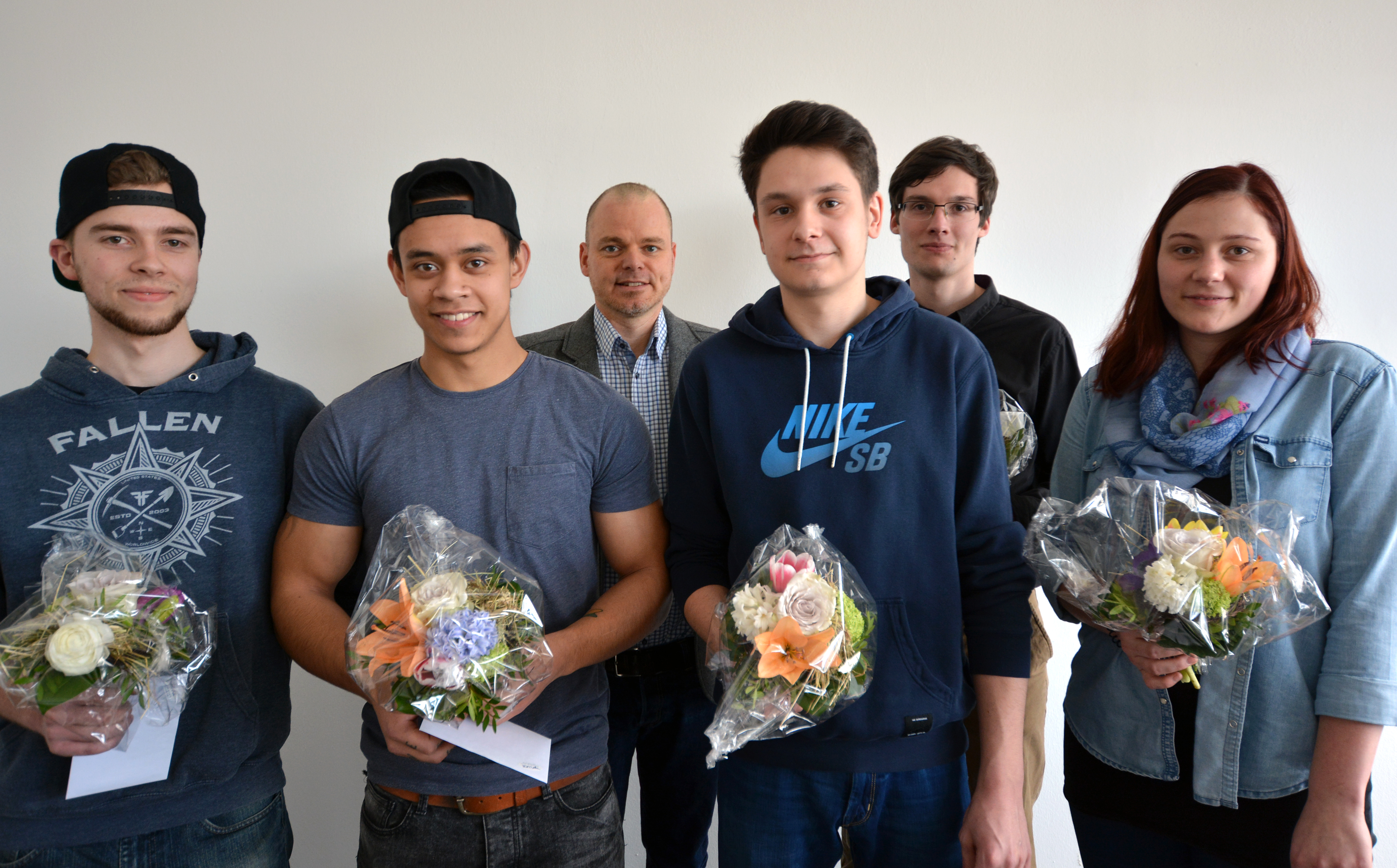 Über den Abschluss ihrer Ausbildung an der Universität Bielefeld freuen sich gemeinsam mit Alexander Steinhäuser (3.v.l.): Florian Koch, Tim Harke, Yannick Schmeichel, Markus Hübner und Gesa True. Foto: Universität Bielefeld