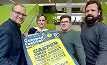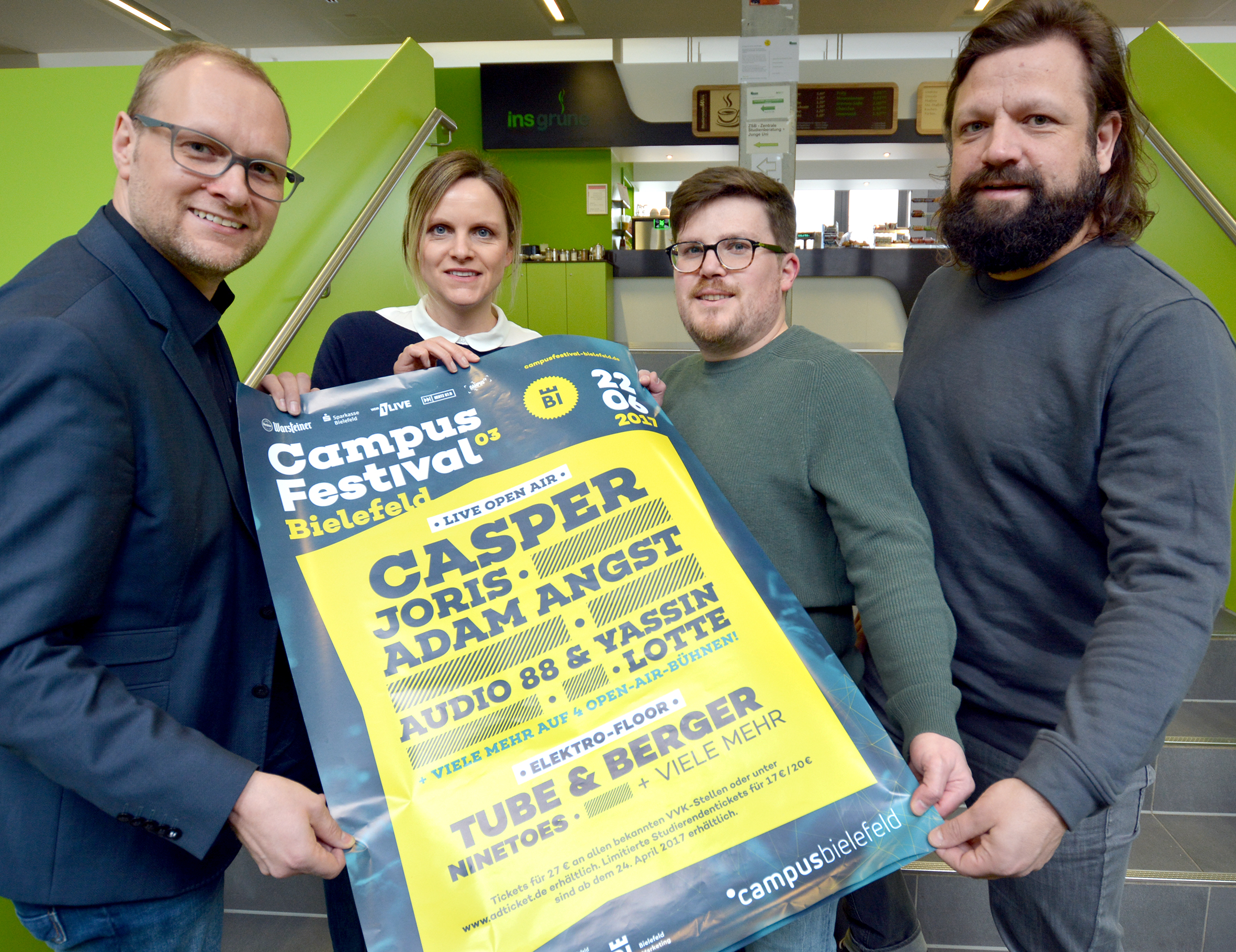 Ingo Lohuis (Universität Bielefeld), Verena Kukuk (Fachhochschule Bielefeld), Giovanni Fusarelli (Bielefeld Marketing) und Walent-Tony Cerkez (Vibra Agency, v. l.), stellten das Programm für das Campus Festival Bielefeld vor.
