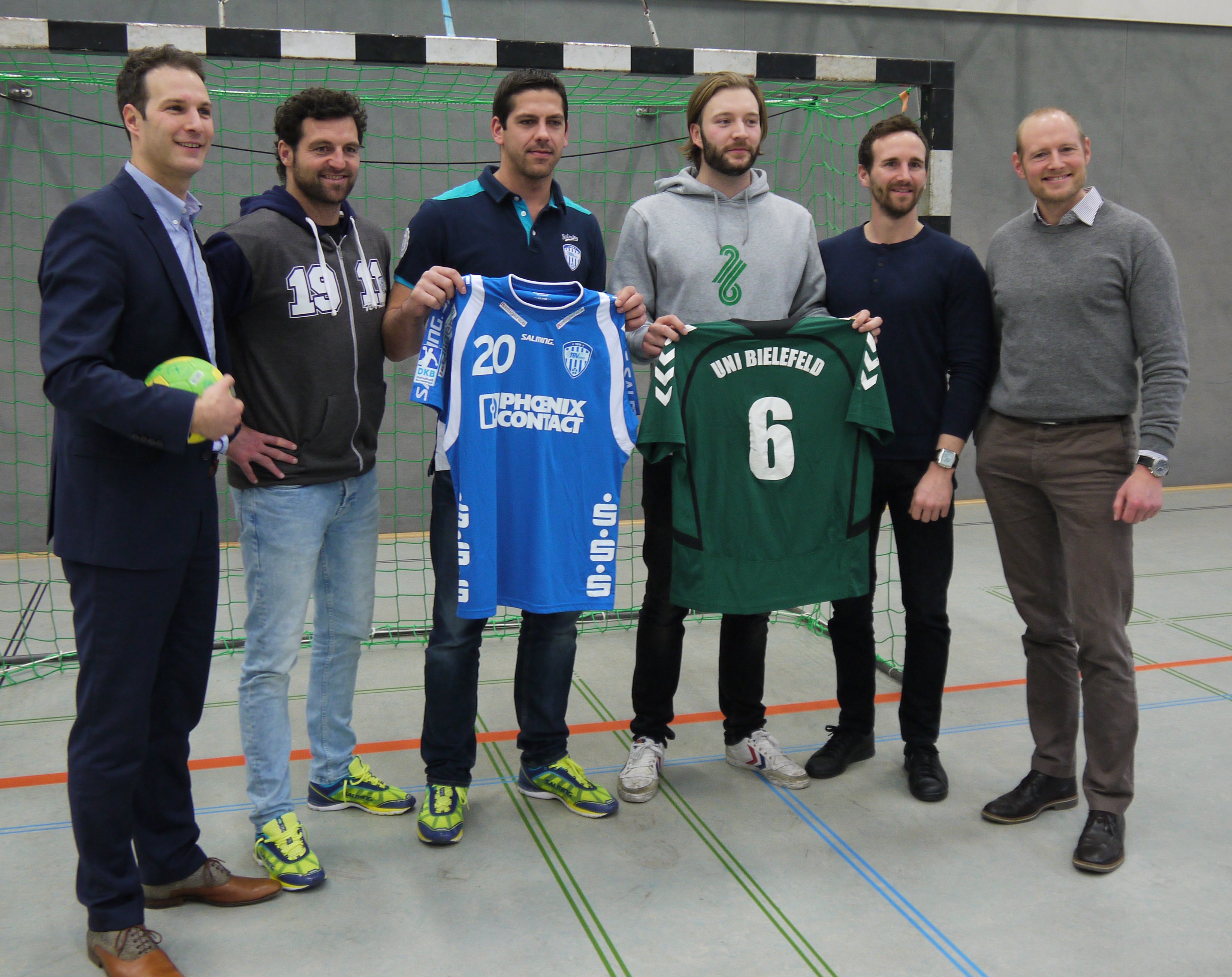 Bereit für das All-Star-Game (v.l.): Geschäftsführer Christian Sprdlik, Trainer Florian Kehrmann und Kapitän Rolf Hermann vom TBV Lemgo sowie Spieler Luca Werner, Trainer Ludwig Vogel und Hochschulsport-Leiter Dr. Marc Samson-Baudisch von der Universität Bielefeld. Foto: Universität Bielefeld